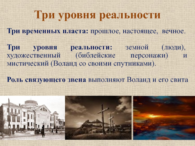 земной (люди), художественный (библейские персонажи) и мистический (Воланд со своими
