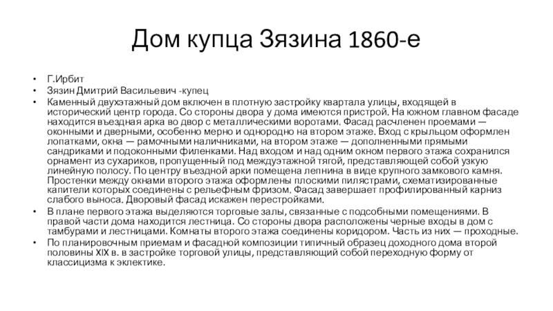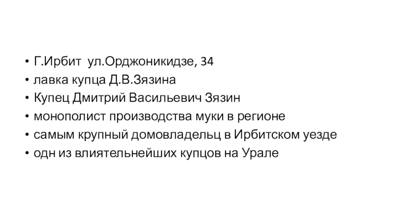 дом со службами известный ирбитский купец первой гильдии Дмитрий Васильевич Зязин, с успехом торговавший крупчаткой, мукой, солью. Будучи одним из самых богатых предпринимателей Ирбита конца XIX — начала XX века, был он достаточно противоречивой натурой.