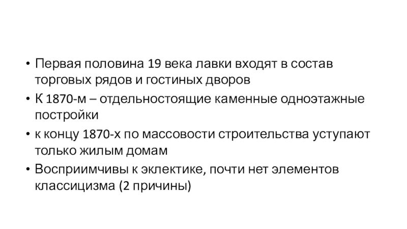 По планировочным приемам и фасадной композиции типичный образец доходного дома второй половины XIX в. в застройке торговой улицы, представляющий собой переходную форму от классицизма к эклектике.