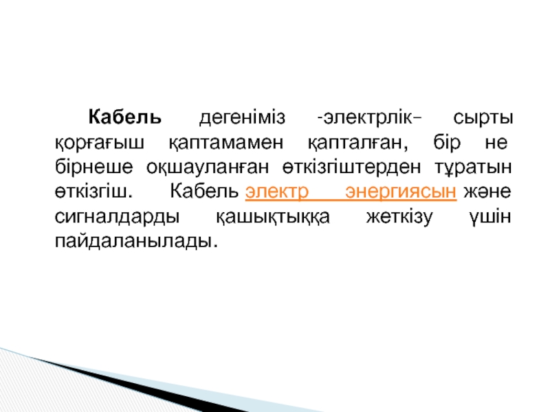 Кабель  дегеніміз -электрлік– сырты қорғағыш қаптамамен қапталған, бір не бірнеше