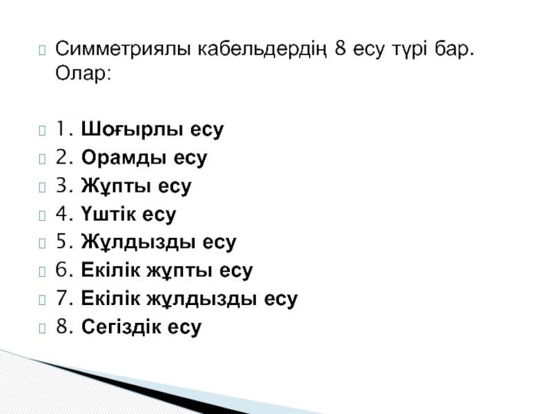 Слайд 4Симметриялы кабельдердің 8 есу түрі бар.Олар: