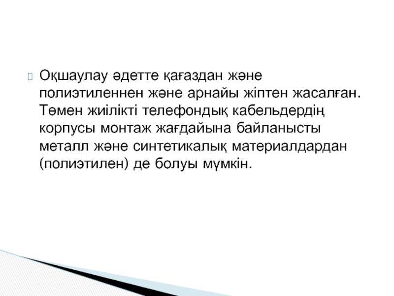 Слайд 9Оқшаулау әдетте қағаздан және полиэтиленнен және арнайы жіптен жасалған. Төмен