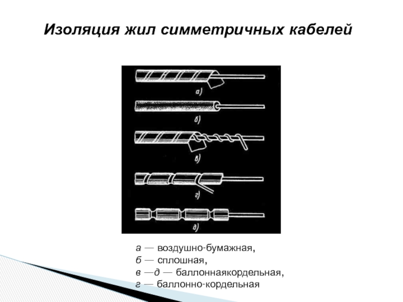а — воздушно-бумажная, б — сплошная, в —д — баллоннаякордельная, г — баллонно-кордельнаяИзоляция жил симметричных кабелей