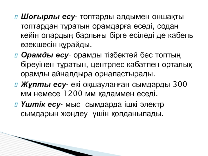 Симметриялы кабельдердің 8 есу түрі бар.Олар:1. Шоғырлы есу2. Орамды есу3. Жұпты есу4. Үштік есу5. Жұлдызды есу6. Екілік