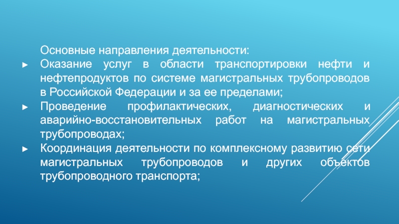 - формирование единой стратегии инвестиций с целью технического перевооружения и развития производственной и социальной инфраструктуры системы магистральных нефтепродуктопроводов России.