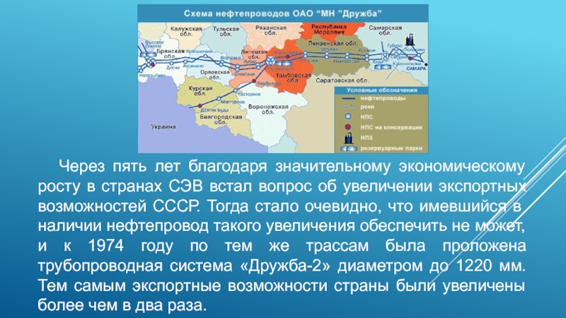 что имевшийся в наличии нефтепровод такого увеличения обеспечить не может, и к 1974 году по тем же трассам была проложена трубопроводная система «Дружба-2» диаметром до 1220 мм. Тем самым экспортные возможности страны были увеличены более чем в два раза.