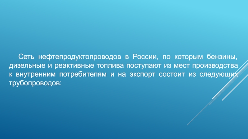Слайд 66Сеть нефтепродуктопроводов в России, по которым бензины, дизельные и реактивные