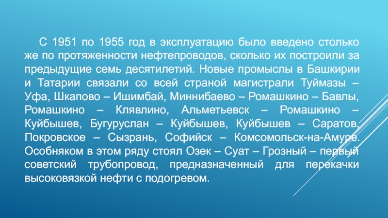 постоянно растущими объемами транспортировки сырья, и в 1947 году завершилась прокладка магистрального нефтепровода Туймазы – Уфа (диаметр 500 мм, протяженность 180 км).