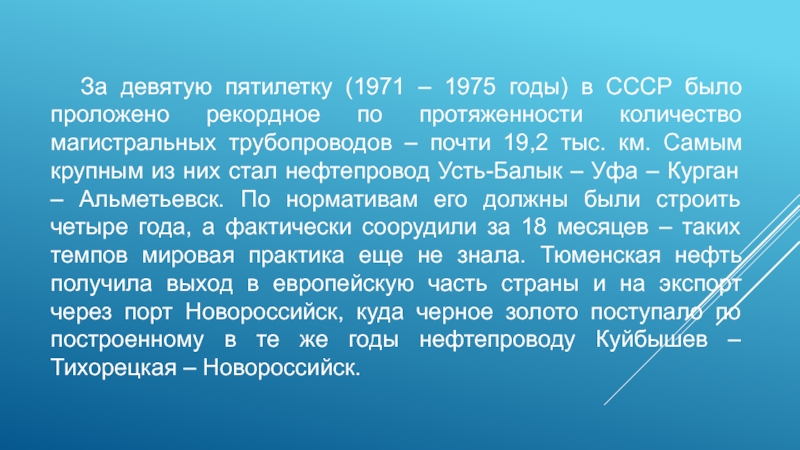 тыс. км. Самым крупным из них стал нефтепровод Усть-Балык – Уфа – Курган – Альметьевск. По нормативам его должны были строить четыре года, а фактически соорудили за 18 месяцев – таких темпов мировая практика еще не знала. Тюменская нефть получила выход в европейскую часть страны и на экспорт через порт Новороссийск, куда черное золото поступало по построенному в те же годы нефтепроводу Куйбышев – Тихорецкая – Новороссийск.