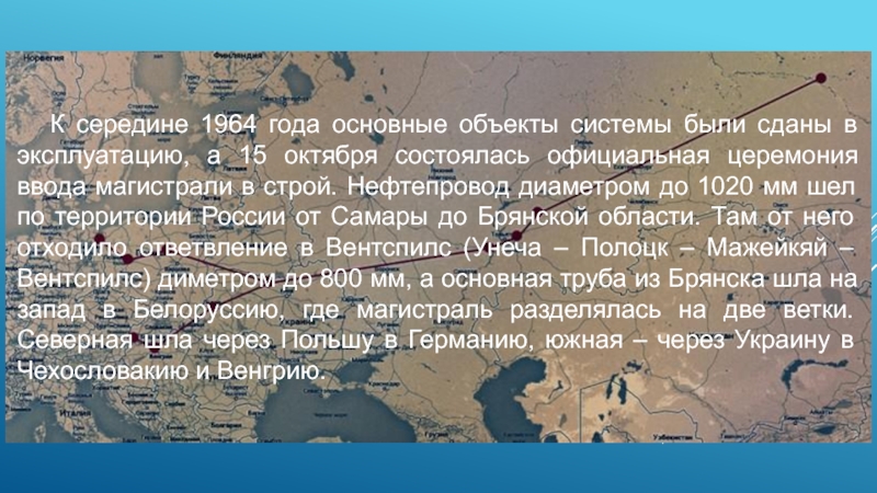 строй. Нефтепровод диаметром до 1020 мм шел по территории России от Самары до Брянской области. Там от него отходило ответвление в Вентспилс (Унеча – Полоцк – Мажейкяй – Вентспилс) диметром до 800 мм, а основная труба из Брянска шла на запад в Белоруссию, где магистраль разделялась на две ветки. Северная шла через Польшу в Германию, южная – через Украину в Чехословакию и Венгрию.