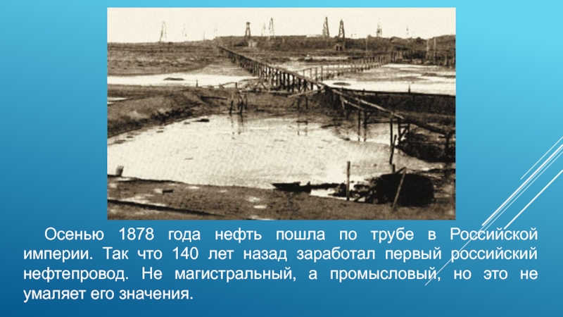 Слайд 6Осенью 1878 года нефть пошла по трубе в Российской империи.