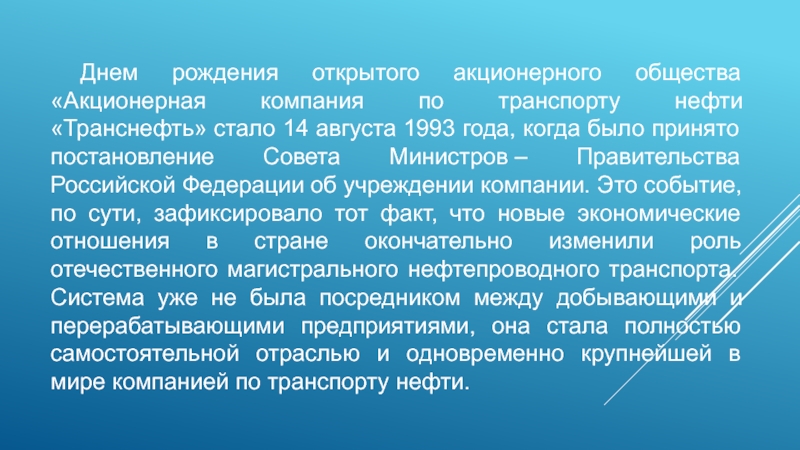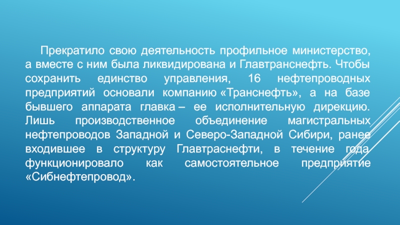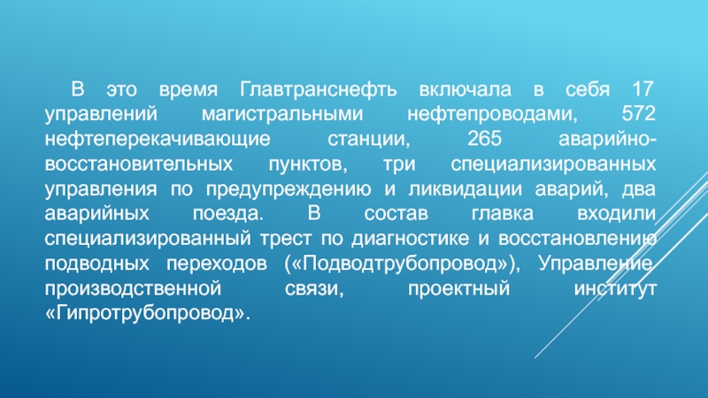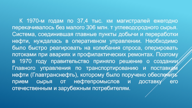 пункты добычи и переработки нефти, нуждалась в оперативном управлении. Необходимо было быстро реагировать на колебания спроса, оперировать потоками при авариях и профилактических ремонтах. Поэтому в 1970 году правительство приняло решение о создании Главного управления по транспортированию и поставкам нефти (Главтранснефть), которому было поручено обеспечить прием сырья от нефтепромыслов и доставку его отечественным и зарубежным потребителям.