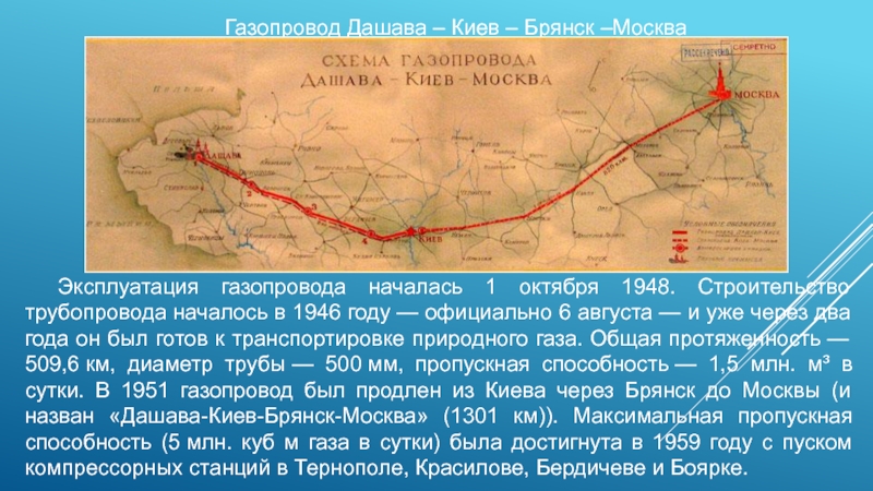августа — и уже через два года он был готов к транспортировке природного газа. Общая протяженность — 509,6 км, диаметр трубы — 500 мм, пропускная способность — 1,5 млн. м³ в сутки. В 1951 газопровод был продлен из Киева через Брянск до Москвы (и назван «Дашава-Киев-Брянск-Москва» (1301 км)). Максимальная пропускная способность (5 млн. куб м газа в сутки) была достигнута в 1959 году с пуском компрессорных станций в Тернополе, Красилове, Бердичеве и Боярке.