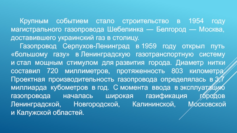 в 1959 году открыл путь «большому газу» в Ленинградскую газотранспортную систему и стал мощным стимулом для развития города. Диаметр нитки составил 720 миллиметров, протяженность 803 километра. Проектная производительность газопровода определялась в 3,7 миллиарда кубометров в год. С момента ввода в эксплуатацию газопровода началась широкая газификация городов Ленинградской, Новгородской, Калининской, Московской и Калужской областей.