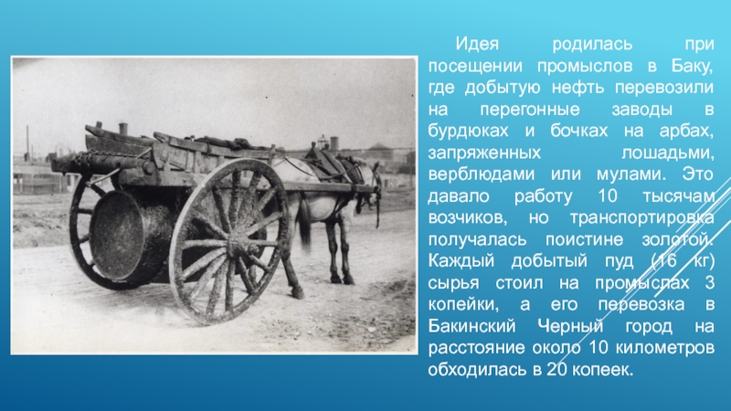 Слайд 4Идея родилась при посещении промыслов в Баку, где добытую нефть