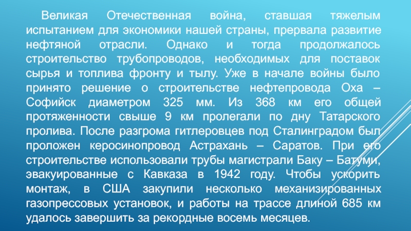 необходимых для поставок сырья и топлива фронту и тылу. Уже в начале войны было принято решение о строительстве нефтепровода Оха – Софийск диаметром 325 мм. Из 368 км его общей протяженности свыше 9 км пролегали по дну Татарского пролива. После разгрома гитлеровцев под Сталинградом был проложен керосинопровод Астрахань – Саратов. При его строительстве использовали трубы магистрали Баку – Батуми, эвакуированные с Кавказа в 1942 году. Чтобы ускорить монтаж, в США закупили несколько механизированных газопрессовых установок, и работы на трассе длиной 685 км удалось завершить за рекордные восемь месяцев.