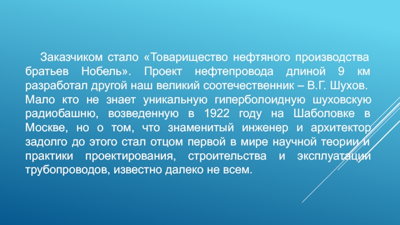 Слайд 7Заказчиком стало «Товарищество нефтяного производства братьев Нобель». Проект нефтепровода длиной