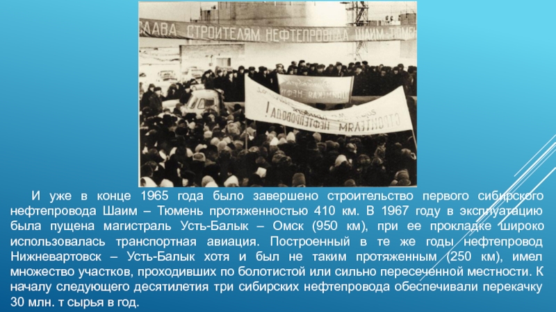 году в эксплуатацию была пущена магистраль Усть-Балык – Омск (950 км), при ее прокладке широко использовалась транспортная авиация. Построенный в те же годы нефтепровод Нижневартовск – Усть-Балык хотя и был не таким протяженным (250 км), имел множество участков, проходивших по болотистой или сильно пересеченной местности. К началу следующего десятилетия три сибирских нефтепровода обеспечивали перекачку 30 млн. т сырья в год.