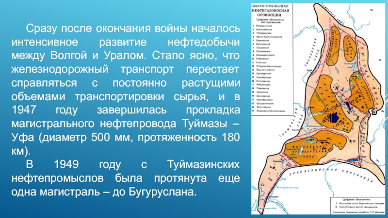 Слайд 15Сразу после окончания войны началось интенсивное развитие нефтедобычи между Волгой