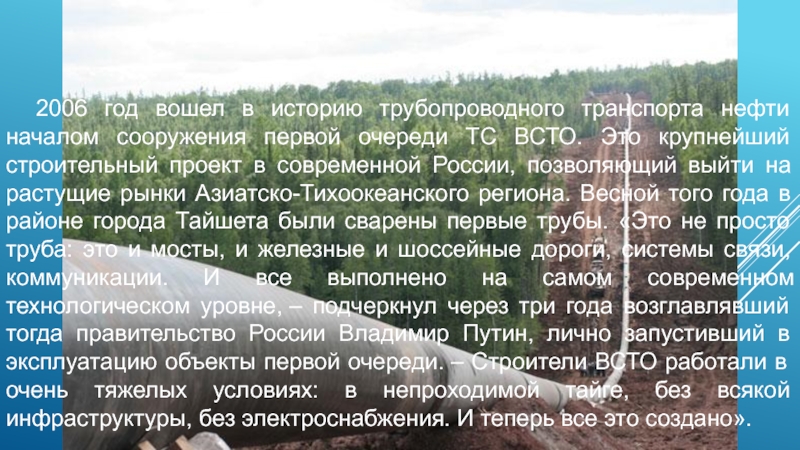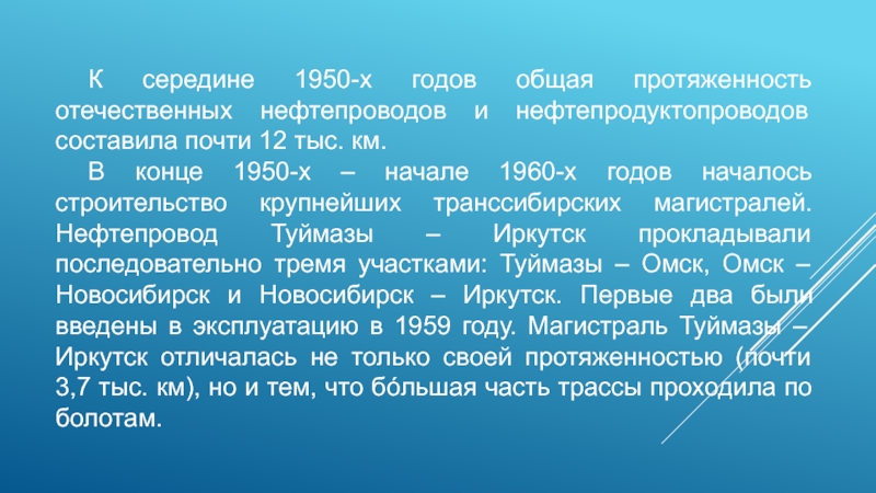годов началось строительство крупнейших транссибирских магистралей. Нефтепровод Туймазы – Иркутск прокладывали последовательно тремя участками: Туймазы – Омск, Омск – Новосибирск и Новосибирск – Иркутск. Первые два были введены в эксплуатацию в 1959 году. Магистраль Туймазы – Иркутск отличалась не только своей протяженностью (почти 3,7 тыс. км), но и тем, что бóльшая часть трассы проходила по болотам.