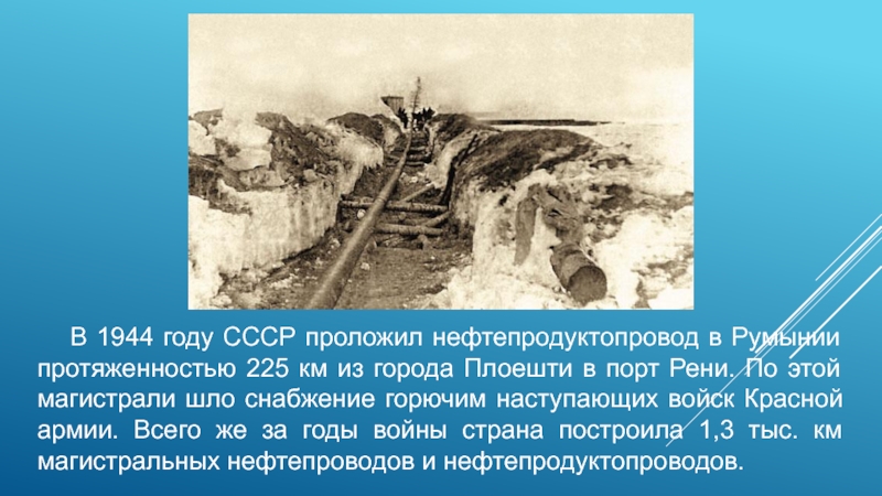 Слайд 14В 1944 году СССР проложил нефтепродуктопровод в Румынии протяженностью 225