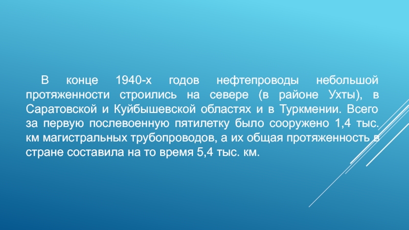 Туркмении. Всего за первую послевоенную пятилетку было сооружено 1,4 тыс. км магистральных трубопроводов, а их общая протяженность в стране составила на то время 5,4 тыс. км.