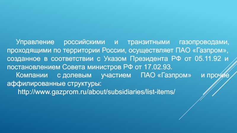 Слайд 76Управление российскими и транзитными газопроводами, проходящими по территории России, осуществляет