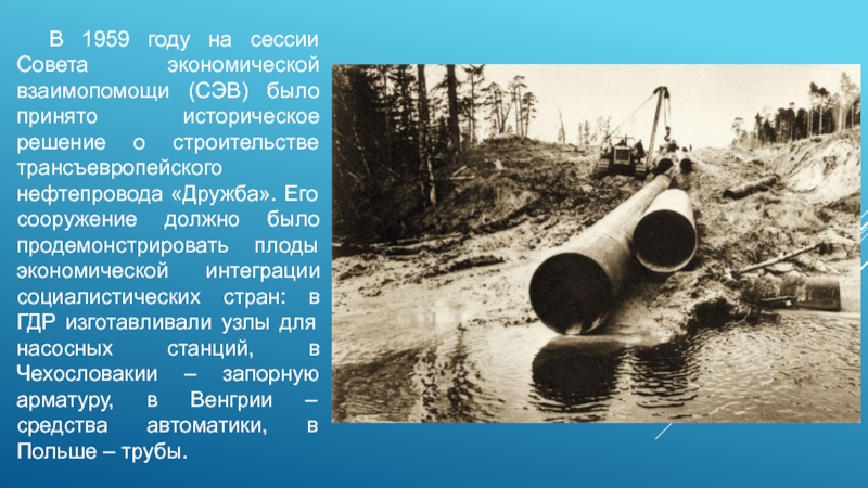 принято историческое решение о строительстве трансъевропейского нефтепровода «Дружба». Его сооружение