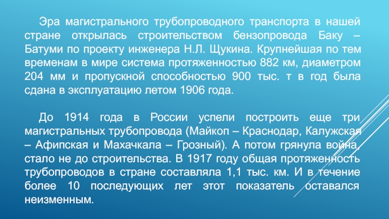 Слайд 9Эра магистрального трубопроводного транспорта в нашей стране открылась строительством бензопровода