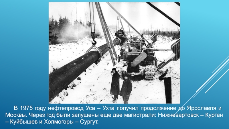 Слайд 32В 1975 году нефтепровод Уса – Ухта получил продолжение до