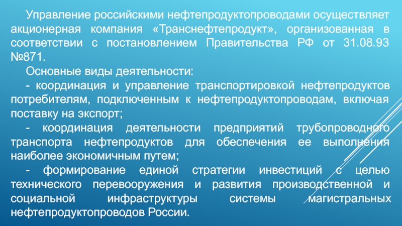 Слайд 68Управление российскими нефтепродуктопроводами осуществляет акционерная компания «Транснефтепродукт», организованная в соответствии