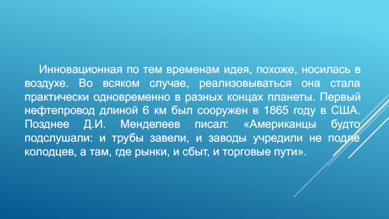 планеты. Первый нефтепровод длиной 6 км был сооружен в 1865 году в США. Позднее Д.И. Менделеев писал: «Американцы будто подслушали: и трубы завели, и заводы учредили не подле колодцев, а там, где рынки, и сбыт, и торговые пути».