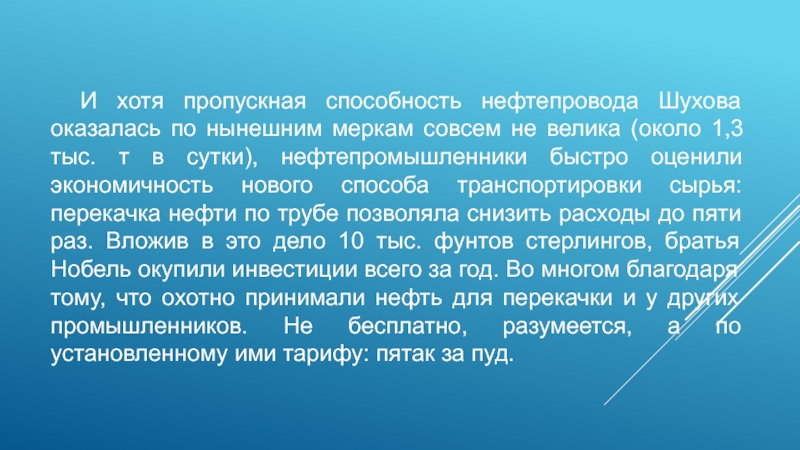Слайд 8И хотя пропускная способность нефтепровода Шухова оказалась по нынешним меркам