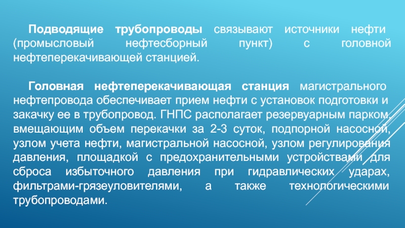 Слайд 18Подводящие трубопроводы связывают источники нефти (промысловый нефтесборный пункт) с головной