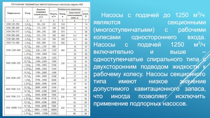 Слайд 39Насосы с подачей до 1250 м3/ч являются секционными (многоступенчатыми) с