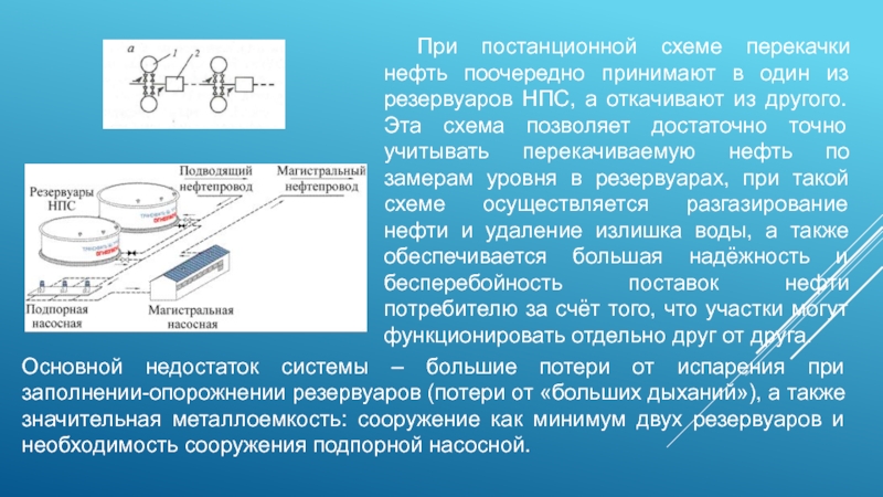 Слайд 31При перекачке через резервуар НПС нефть от предыдущей станции поступает