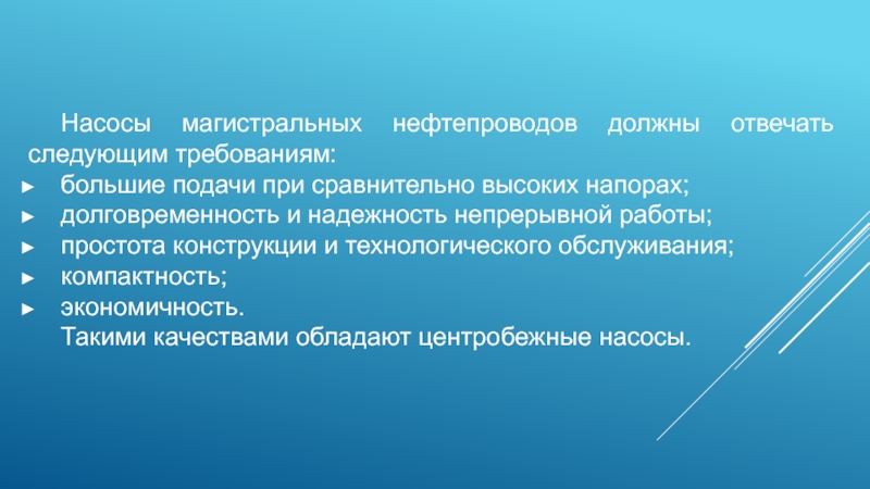 Слайд 37Насосы магистральных нефтепроводов должны отвечать следующим требованиям: