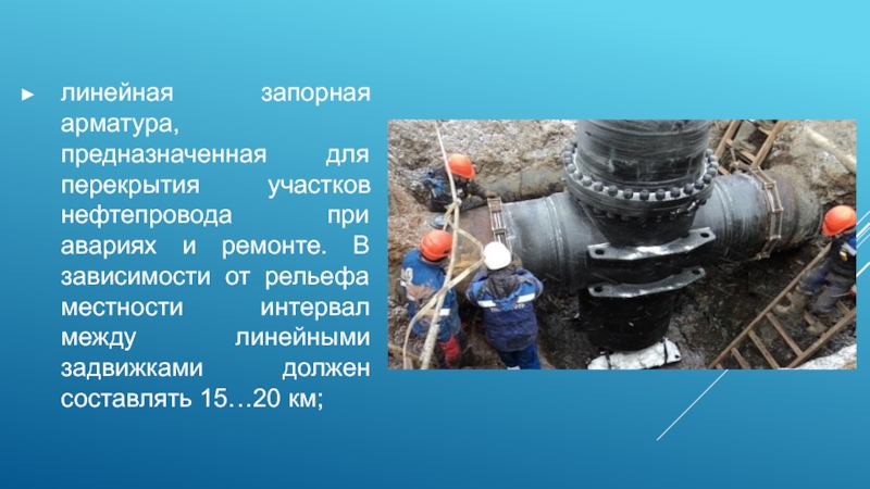 Слайд 23линейная запорная арматура, предназначенная для перекрытия участков нефтепровода при авариях