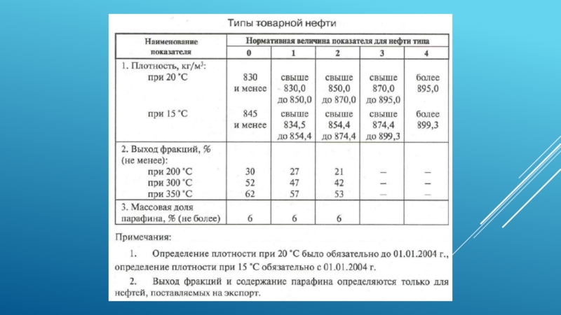 Согласно ГОСТ Р «Нефть. Общие технические условия» товарные нефти подразделяются на классы, типы, группы и виды.