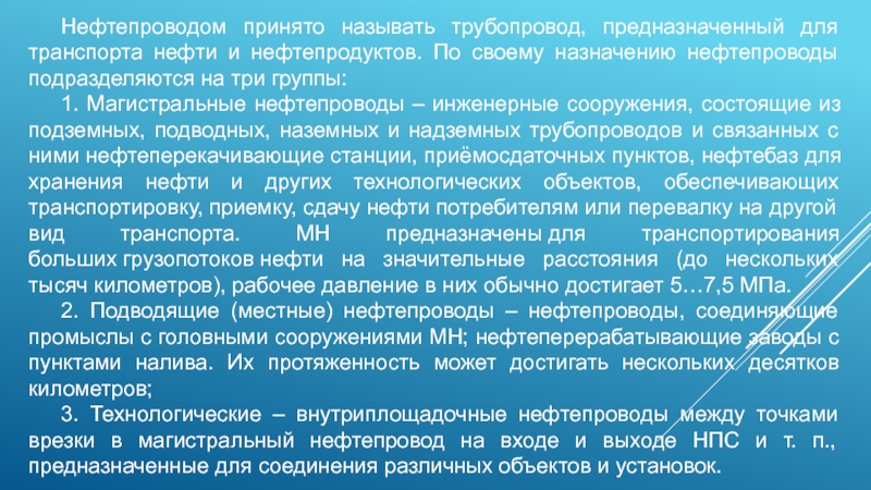 Слайд 13Нефтепроводом принято называть трубопровод, предназначенный для транспорта нефти и нефтепродуктов.