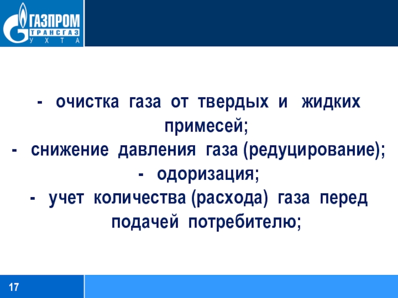 -  очистка газа от твердых и  жидких   примесей;-  снижение давления газа (редуцирование);-