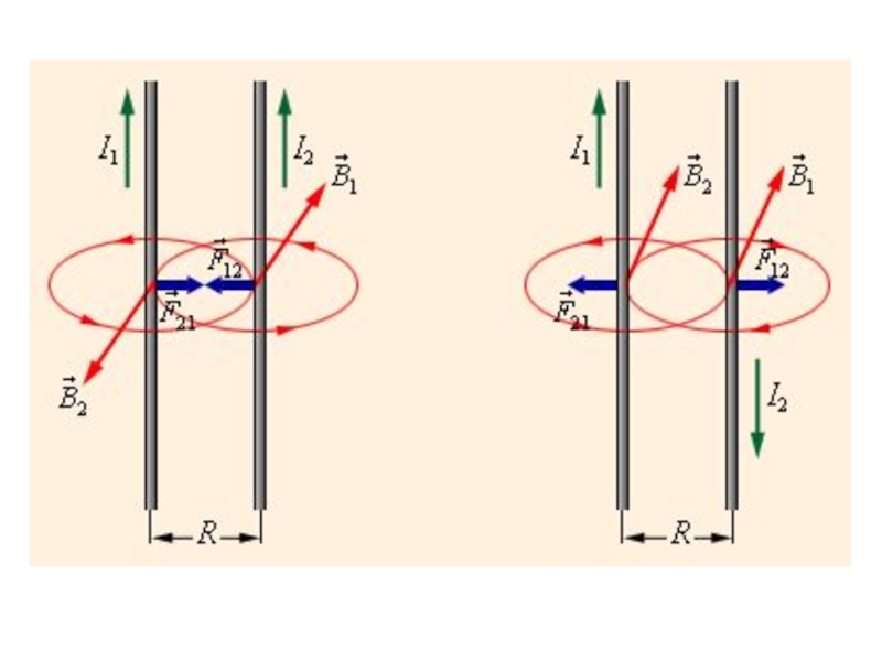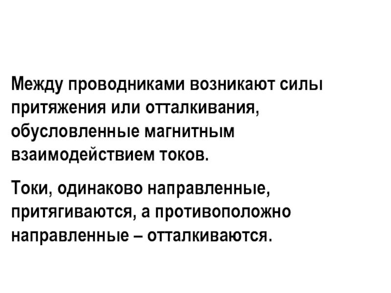 Слайд 25Между проводниками возникают силы притяжения или отталкивания, обусловленные магнитным взаимодействием