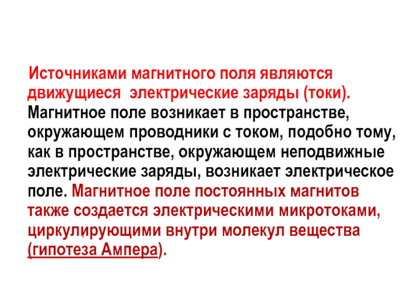 как в пространстве, окружающем неподвижные электрические заряды, возникает электрическое поле. Магнитное поле постоянных магнитов также создается электрическими микротоками, циркулирующими внутри молекул вещества (гипотеза Ампера).