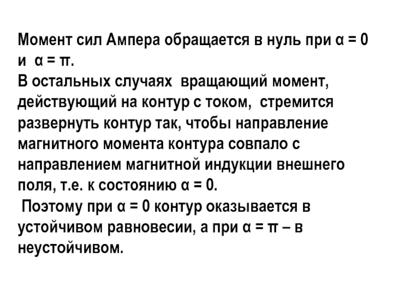 Слайд 36Момент сил Ампера обращается в нуль при = 0