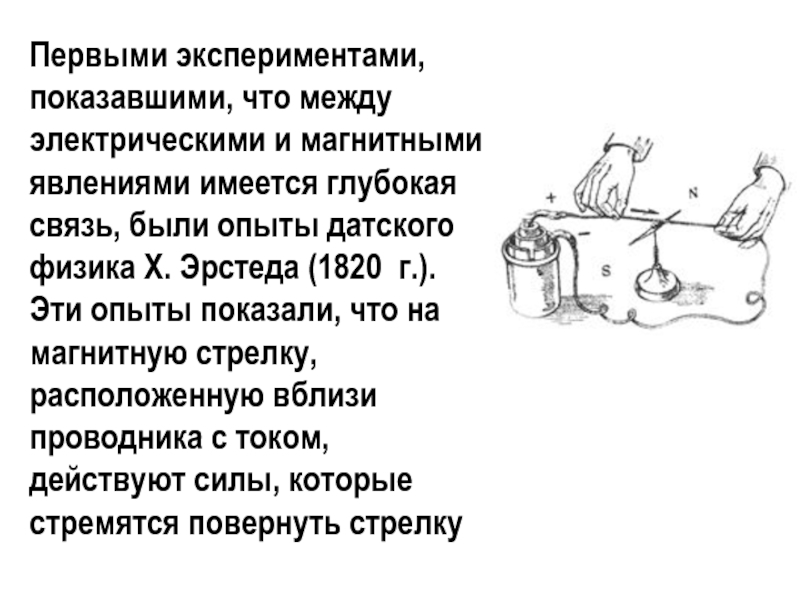Слайд 3Первыми экспериментами, показавшими, что между электрическими и магнитными явлениями имеется