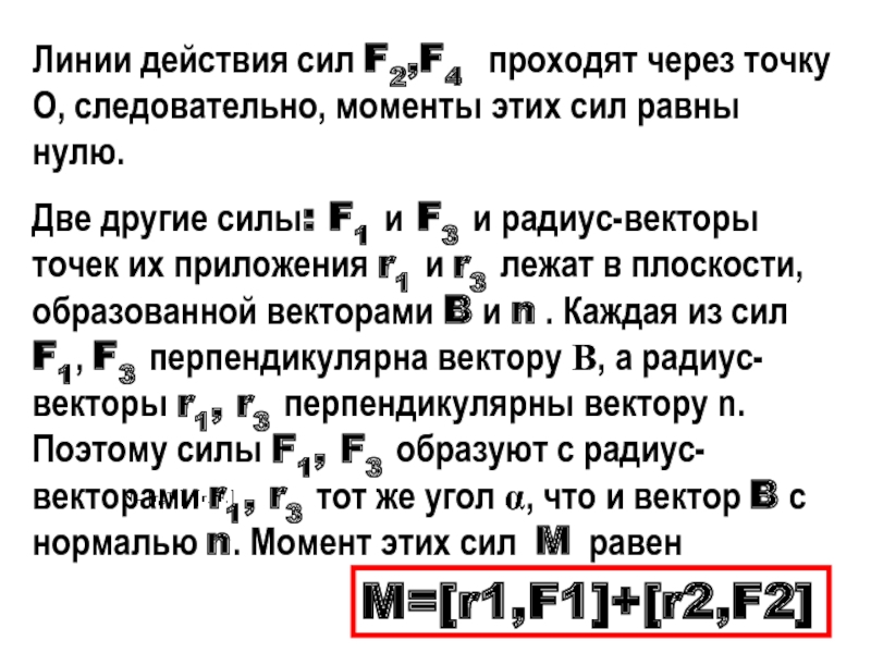 и радиус-векторы точек их приложения r1 и r3 лежат в плоскости, образованной векторами B и n . Каждая из сил F1, F3 перпендикулярна вектору В, а радиус-векторы r1, r3 перпендикулярны вектору n. Поэтому силы F1, F3 образуют с радиус-векторами r1, r3 тот же угол , что и вектор B с нормалью n. Момент этих сил M равен