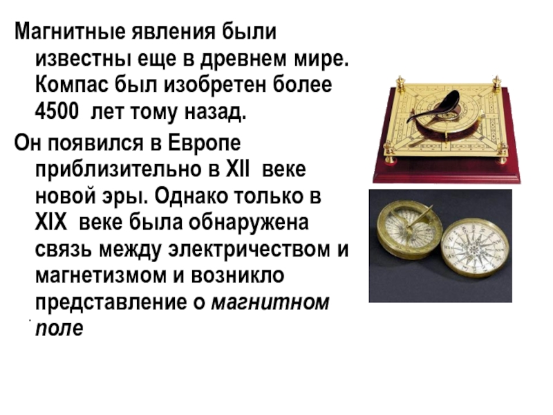 в XII веке новой эры. Однако только в XIX веке была обнаружена связь между электричеством и магнетизмом и возникло представление о магнитном поле