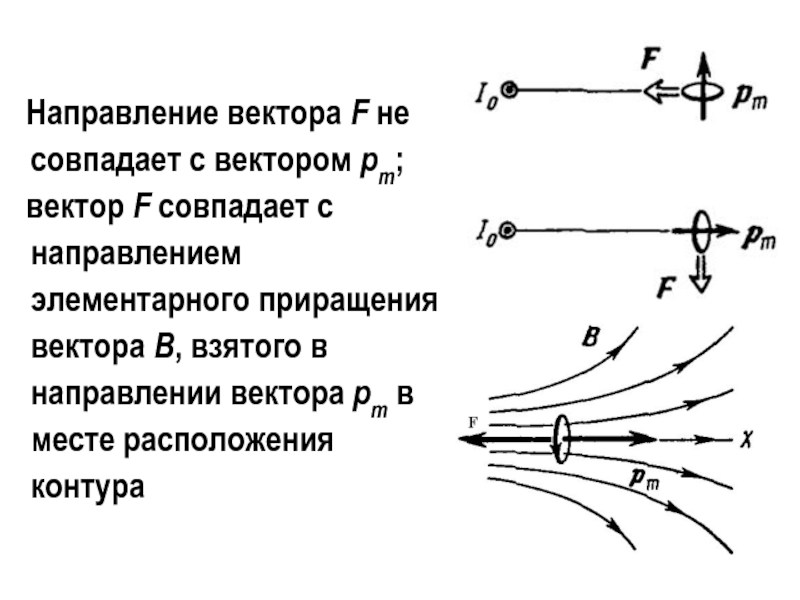 вектор F совпадает с направлением элементарного приращения вектора B, взятого в направлении вектора pm в месте расположения контура