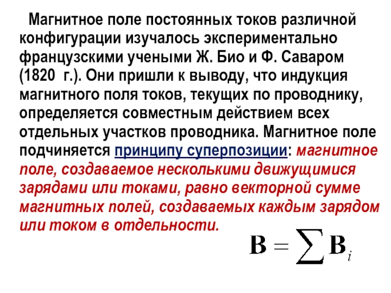 пришли к выводу, что индукция магнитного поля токов, текущих по проводнику, определяется совместным действием всех отдельных участков проводника. Магнитное поле подчиняется принципу суперпозиции: магнитное поле, создаваемое несколькими движущимися зарядами или токами, равно векторной сумме магнитных полей, создаваемых каждым зарядом или током в отдельности.