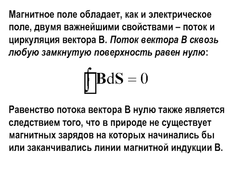 Равенство потока вектора В нулю также является следствием того, что в природе не существует магнитных зарядов на которых начинались бы или заканчивались линии магнитной индукции В.
